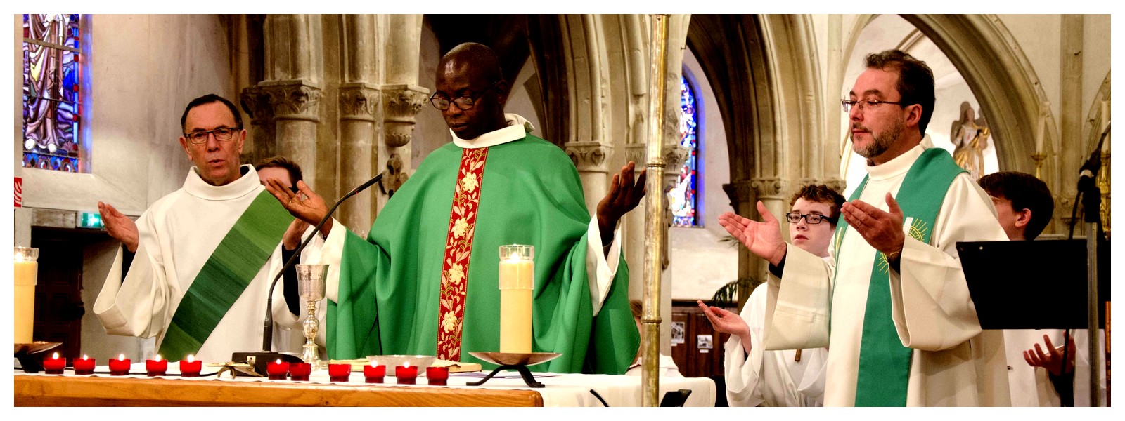 Après ce temps de partage et une petite promenade en centre bourg, notamment devant l’une des nombreuses grotte de la Vierge Marie, nous nous sommes retrouvés à l’église pour la célébration de l’Eucharistie.