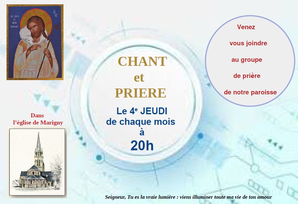 Tous les 4èmes jeudi du mois, temps de prière ouvert à tous de 20h30 à 21h15 dans l’église de Marigny.