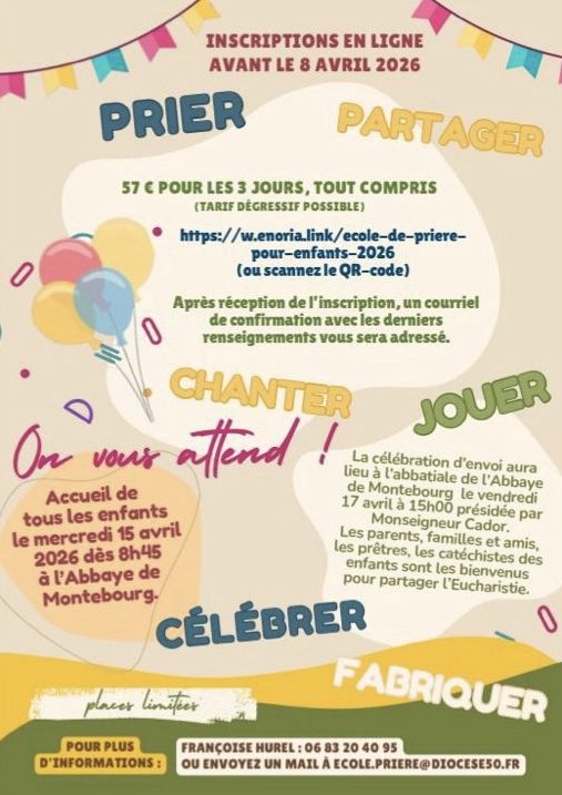 La célébration d’envoi aura lieu à l’Abbaye de Montebourg le vendredi 17 avril à 15h00. Les parents, familles et amis, les prêtres, les catéchistes des enfants et tous les anciens de l’EdP sont les bienvenus pour vivre l’Eucharistie tous ensemble.